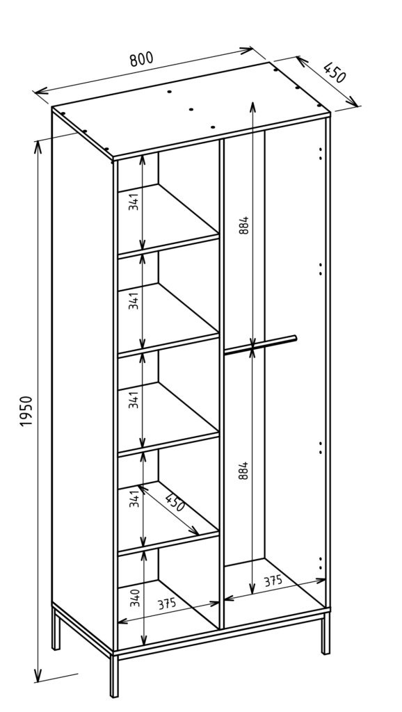 Za gładkimi frontami kryje się przestronne wnętrze z miejscem na ubrania, półki i wieszaki. Układ został zaprojektowany tak, by maksymalnie wykorzystać przestrzeń i zapewnić komfort przechowywania. Szafa łączy w sobie praktyczność i estetykę w najczystszej postaci.