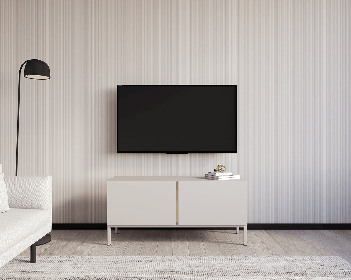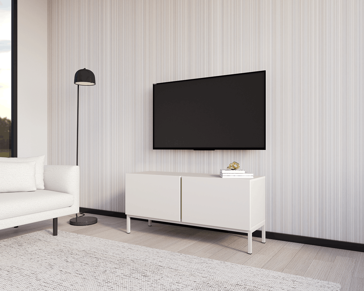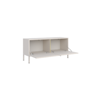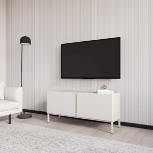 Za dwoma drzwiami kryje się praktyczna przestrzeń do przechowywania sprzętu, kabli i akcesoriów. Dzięki temu przestrzeń wokół telewizora pozostaje uporządkowana, a całość prezentuje się spójnie i schludnie. Szafka łączy w sobie funkcjonalność i minimalistyczną estetykę.