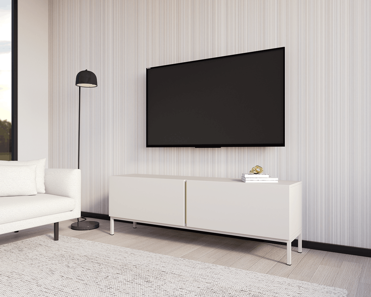 Szafka RTV Eloro o szerokości 140 cm to kompaktowy wariant kolekcji, który doskonale sprawdzi się w mniejszych przestrzeniach. Jej projekt, opracowany przez zespół SOLVEE, emanuje prostotą i funkcjonalnością, podkreślając charakter nowoczesnych wnętrz.