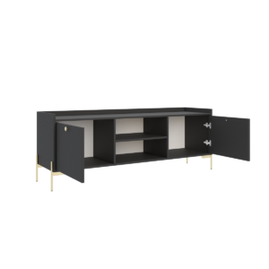 Szafka RTV z dwiema uchylnymi drzwiami z kolekcji LUX to nowoczesne rozwiązanie do salonu, które łączy elegancję z wygodą użytkowania. Jej prosta, geometryczna forma doskonale wpisuje się w aktualne trendy wnętrzarskie, a jednocześnie zapewnia przestrzeń na przechowywanie sprzętu i akcesoriów.