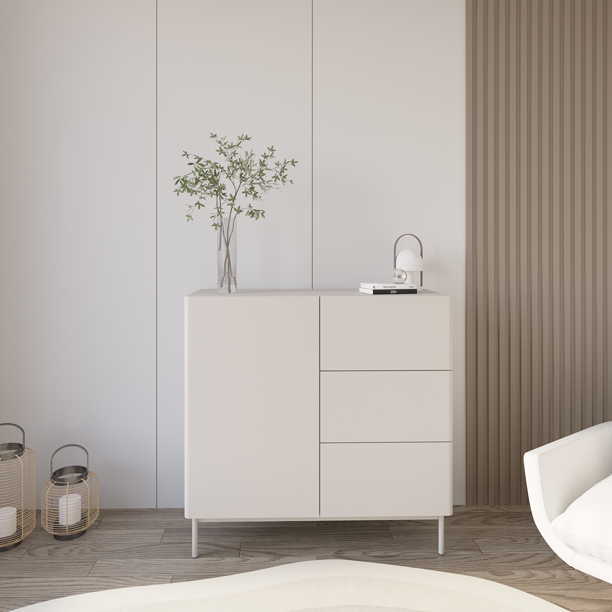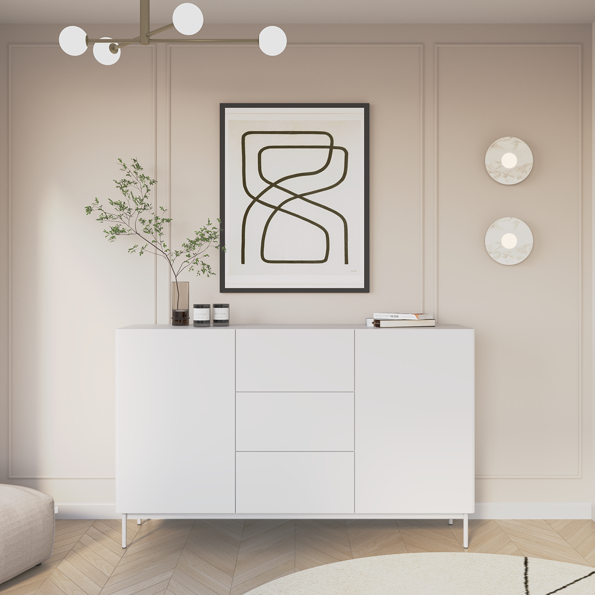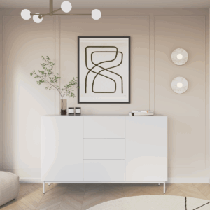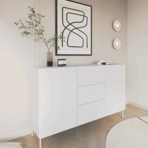 Dzięki subtelnym detalom i wyważonym proporcjom, komoda doskonale odnajduje się w różnych aranżacjach — od przytulnych wnętrz w stylu natural po bardziej surowe, minimalistyczne przestrzenie. To połączenie elegancji, prostoty i praktyczności w najlepszym wydaniu.