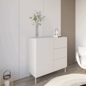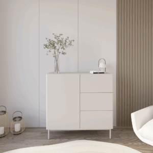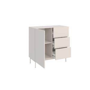 Nowoczesna komoda Olio z drzwiami i trzema pojemnymi szufladami to idealne połączenie estetyki i funkcjonalności. Jej zaokrąglone narożniki i gładkie fronty wprowadzają do wnętrza miękkość, a minimalistyczna forma sprawia, że doskonale komponuje się zarówno w salonie, jak i sypialni.