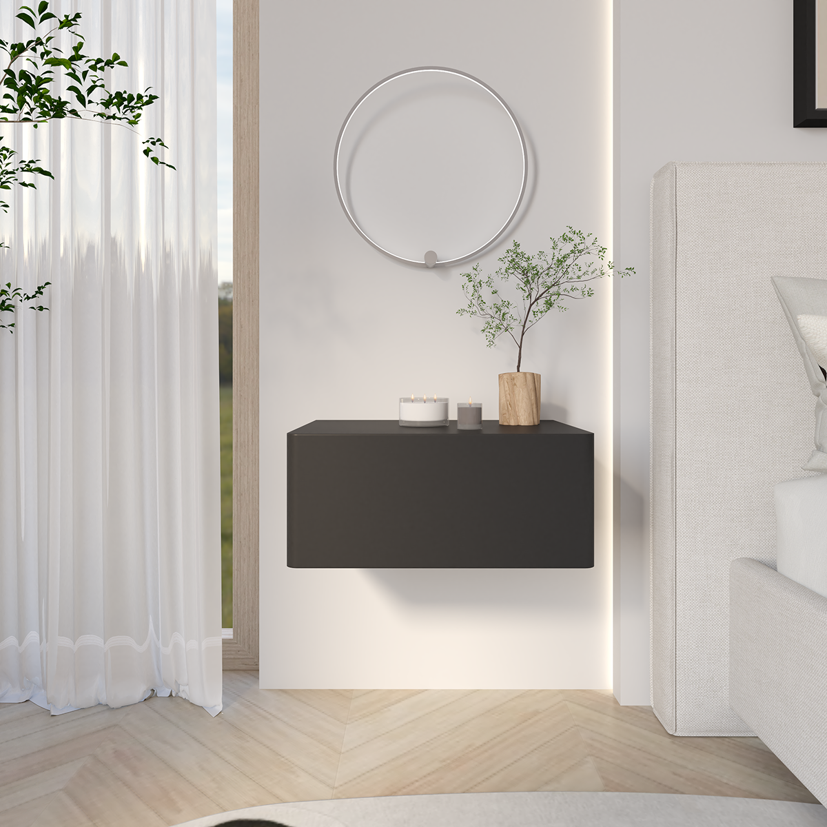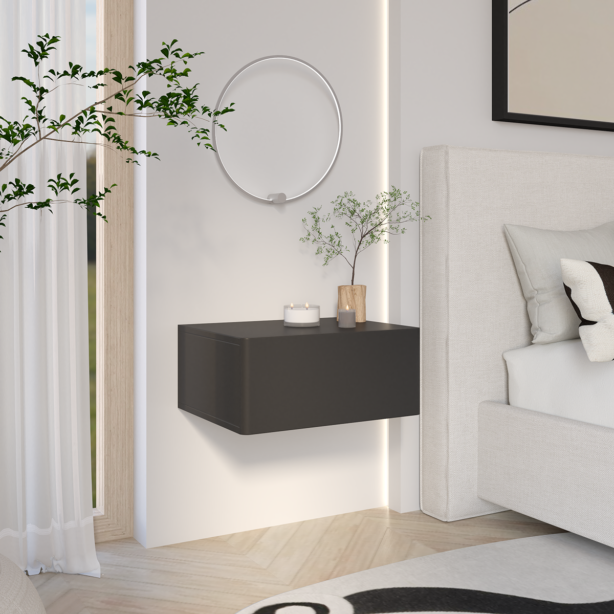 Wisząca szafka nocna Olio to wyjątkowy akcent w sypialni — lekka, nowoczesna i niezwykle praktyczna. Zawieszona na ścianie, dodaje wnętrzu wizualnej przestronności, a zaokrąglone krawędzie nadają jej miękkości i elegancji.