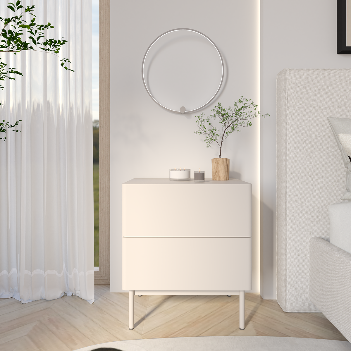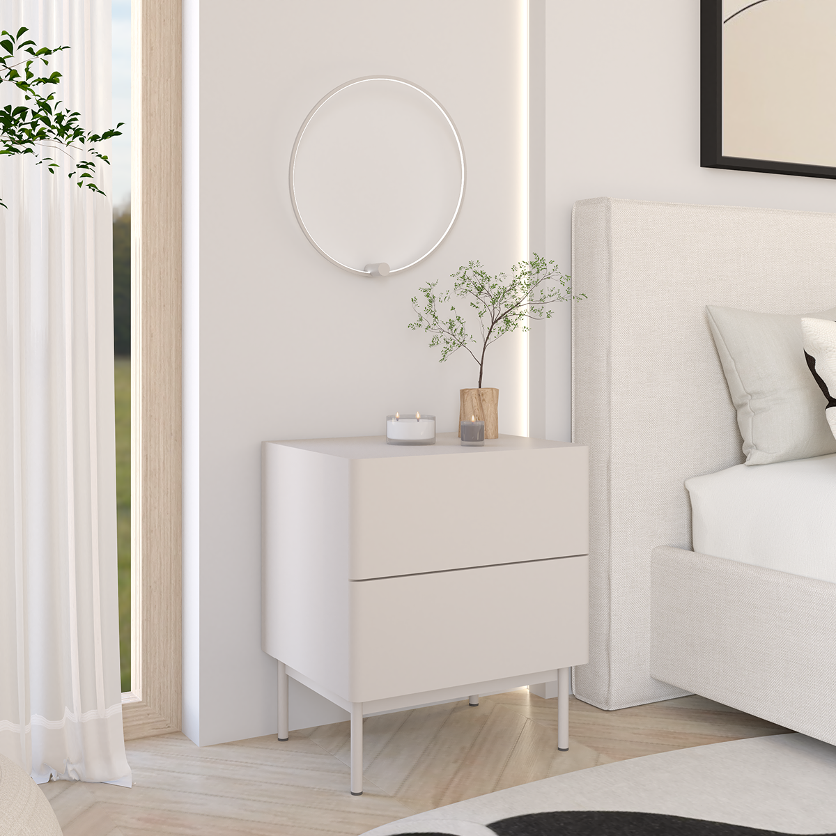 Szafka nocna Olio to kompaktowy mebel, który łączy w sobie praktyczność i subtelną elegancję. Zaokrąglone formy, brak uchwytów i gładkie powierzchnie tworzą wrażenie spokoju — idealne dla przestrzeni wypoczynku.