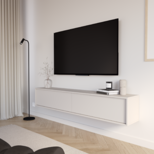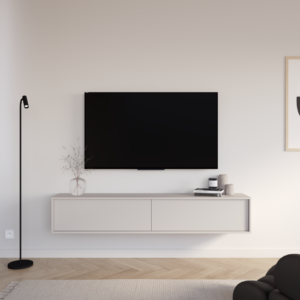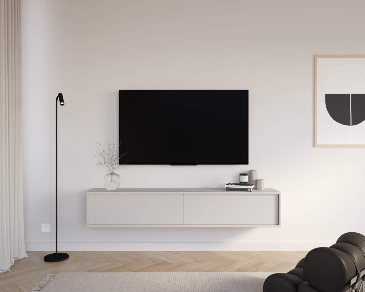 Wisząca szafka RTV z kolekcji Kalma to kwintesencja nowoczesnego minimalizmu i ponadczasowej elegancji. Gładkie fronty bez uchwytów podkreślają czystą, harmonijną formę bryły, tworząc spójną i wyjątkowo lekką wizualnie całość.