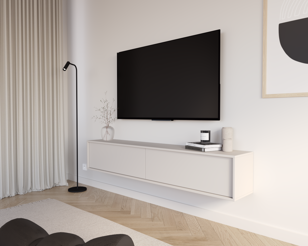 Konstrukcja wisząca pozwala na wizualne uporządkowanie przestrzeni, a wnętrze szafki zapewnia praktyczne miejsce na sprzęt RTV oraz drobne akcesoria. To idealne rozwiązanie dla osób ceniących estetykę, funkcjonalność i nowoczesny porządek we wnętrzu.