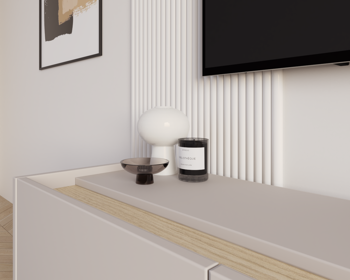 SENSO to kolekcja, w której minimalistyczna forma została wzbogacona o charakterystyczny detal. Dekoracyjny pas w górnej części bryły nadaje meblowi unikalnego wyglądu i subtelnie przełamuje prostotę frontów. Dzięki temu szafka doskonale odnajduje się w nowoczesnych wnętrzach, wprowadzając do nich elegancję i wyrazisty, ale nadal spójny akcent.