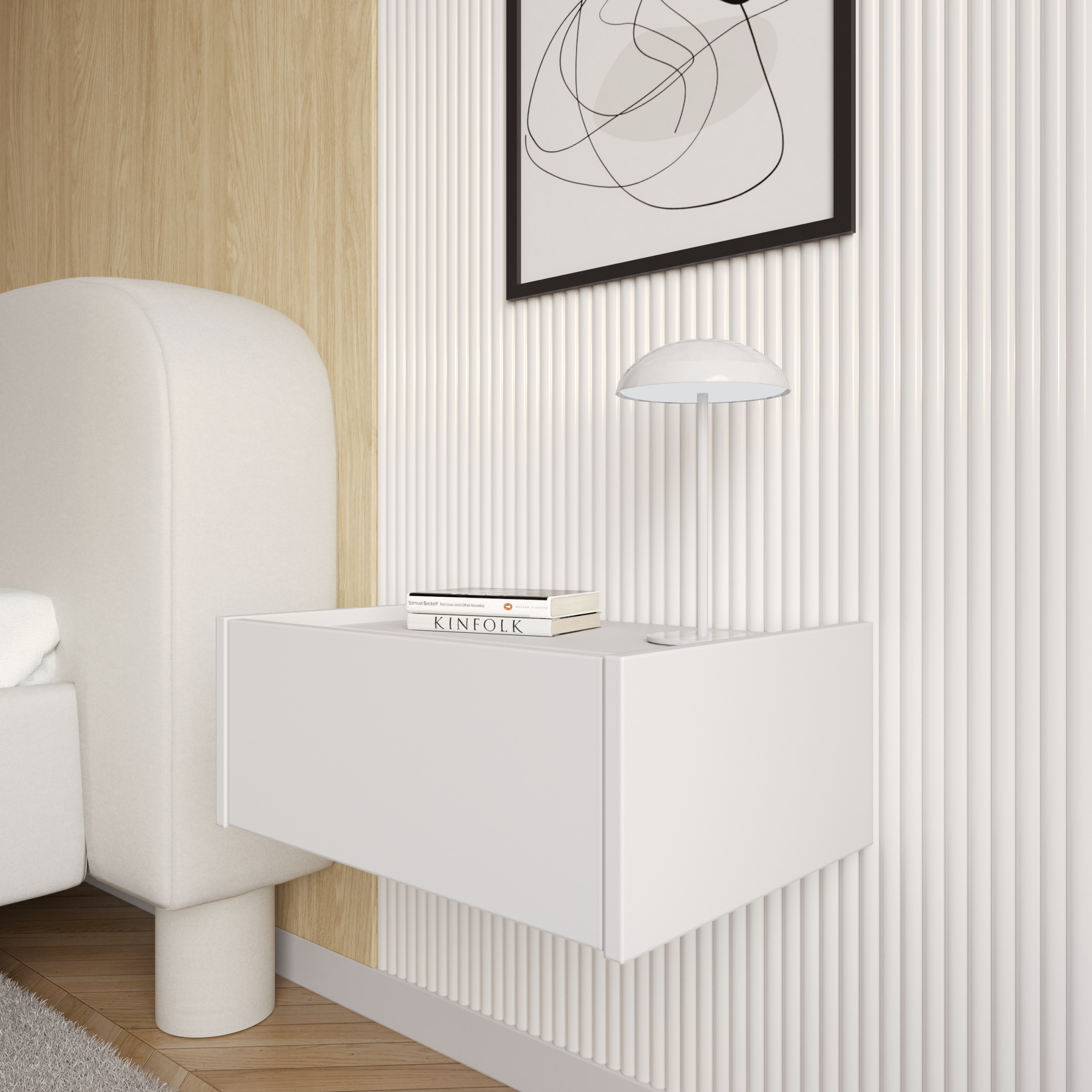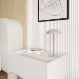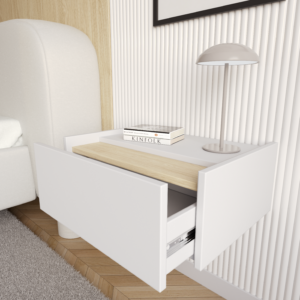Wisząca forma szafki wprowadza do wnętrza lekkość i nowoczesny charakter, jednocześnie ułatwiając utrzymanie porządku wokół łóżka. Przemyślane wnętrze zapewnia wygodne miejsce na najpotrzebniejsze rzeczy – od książki po telefon czy drobne akcesoria – dzięki czemu wszystko masz zawsze pod ręką.