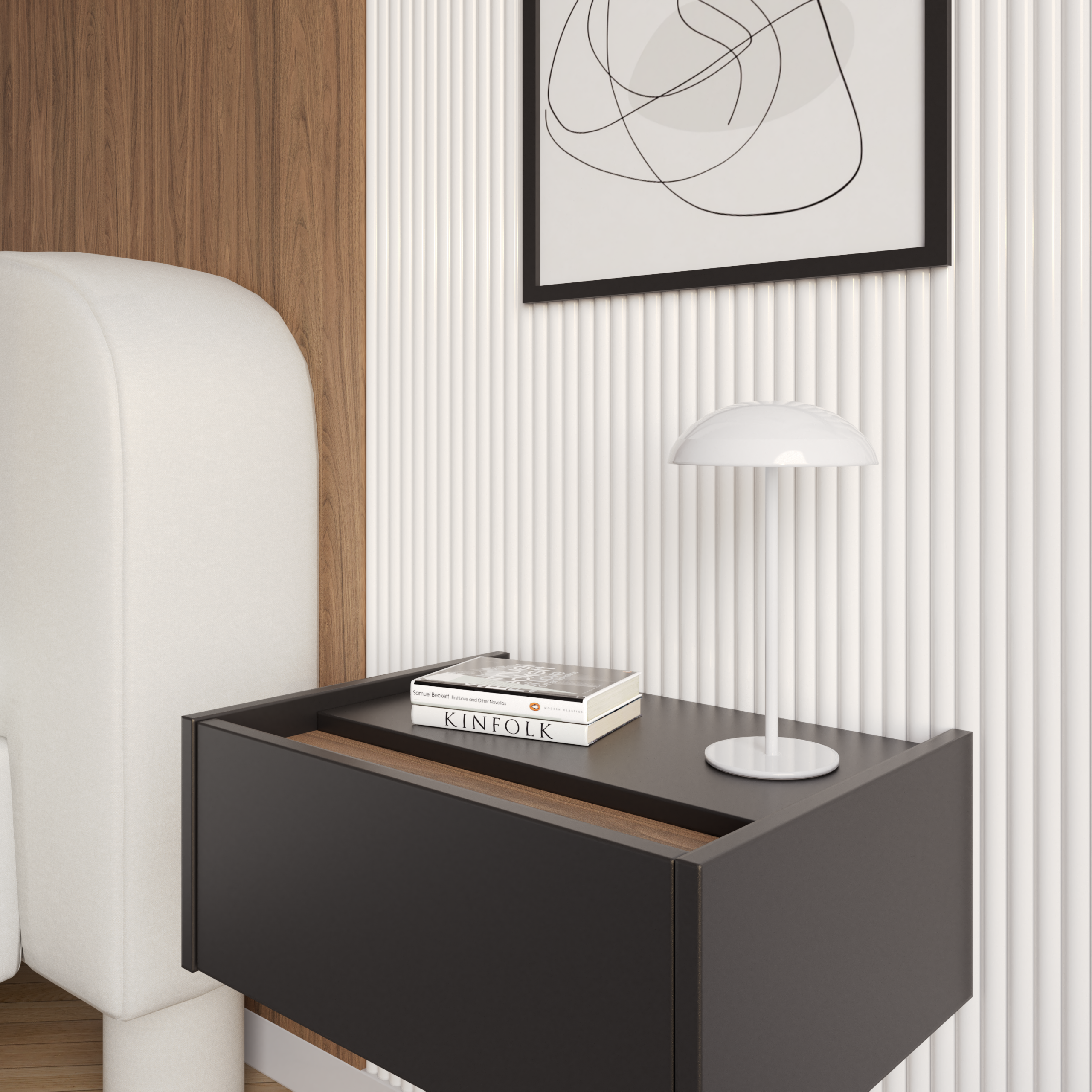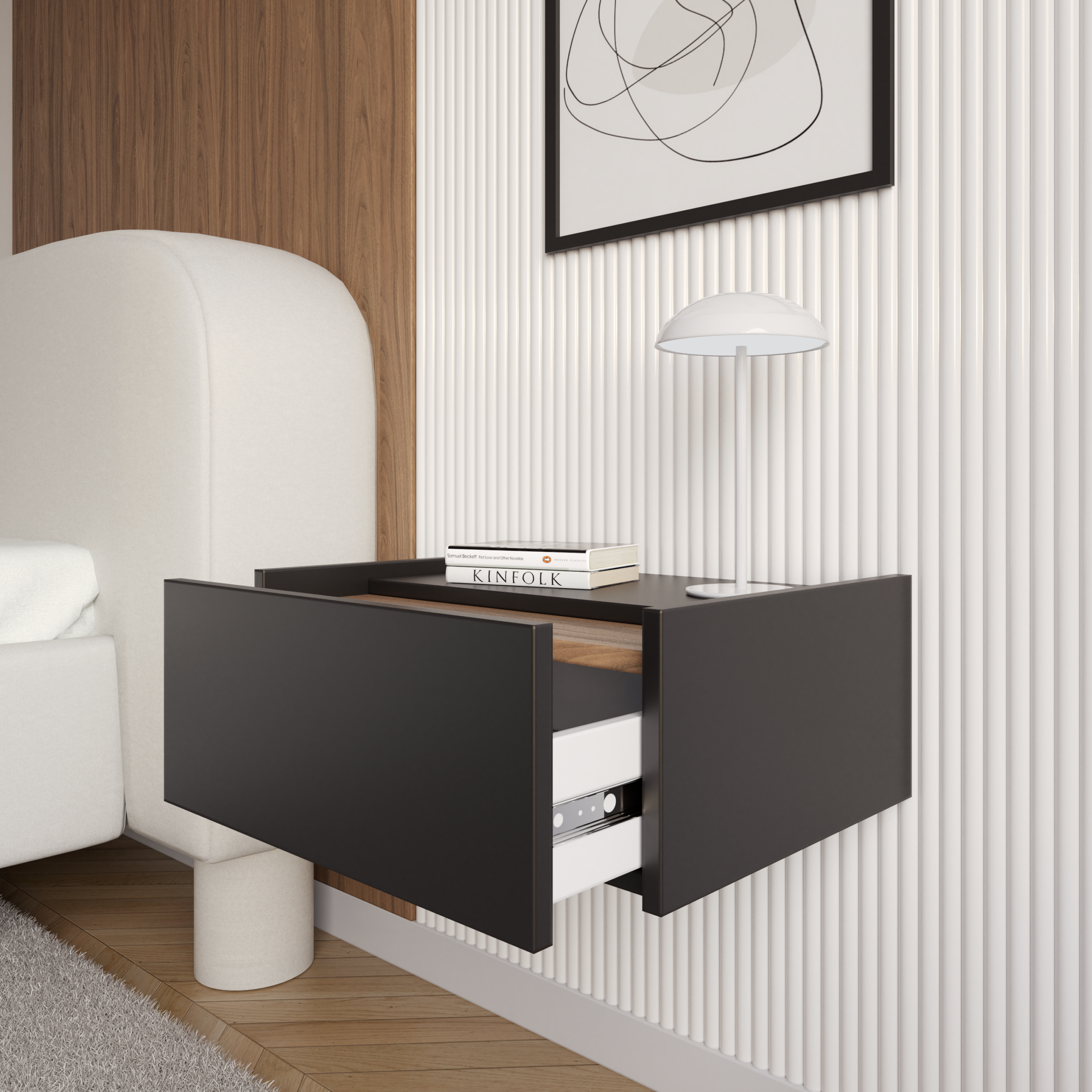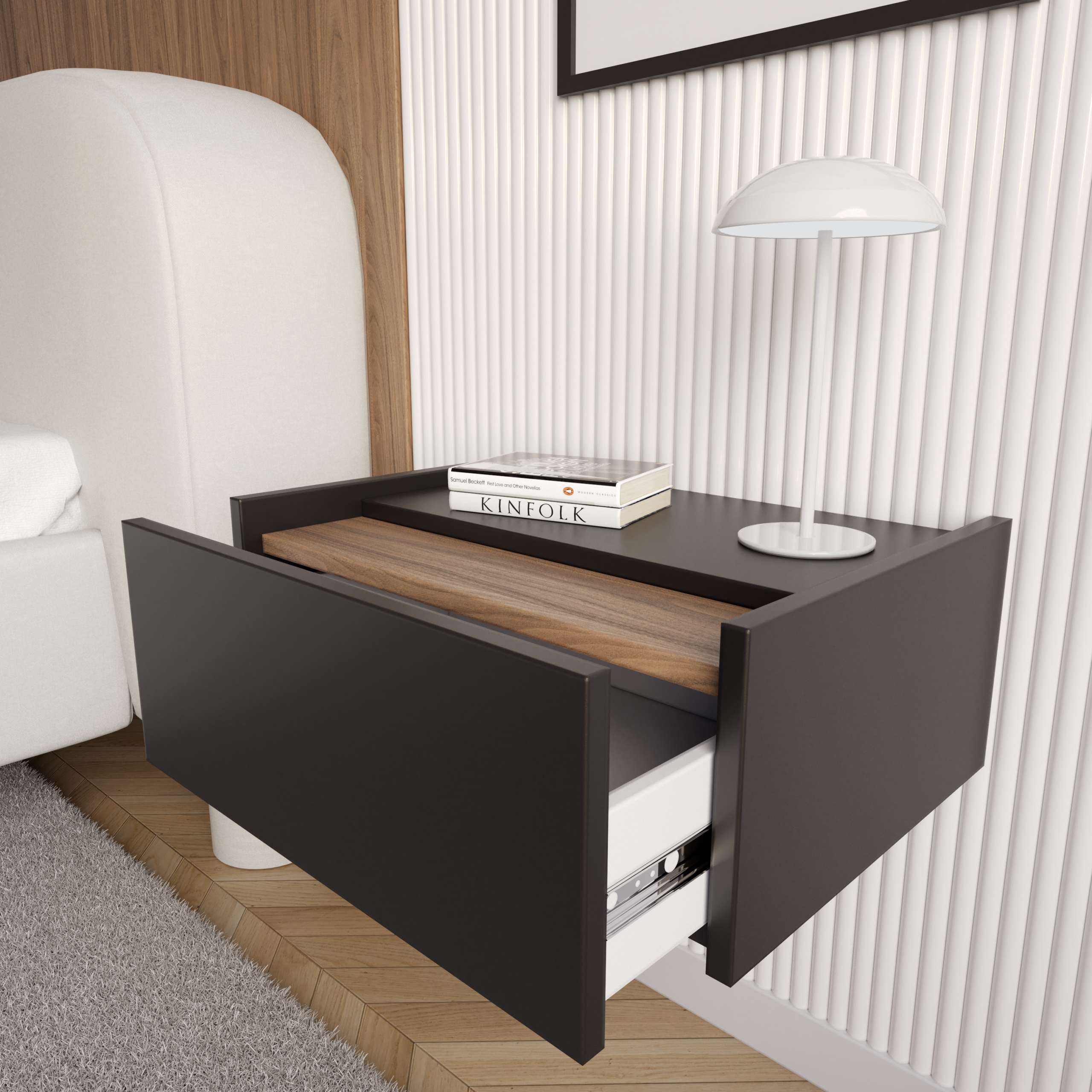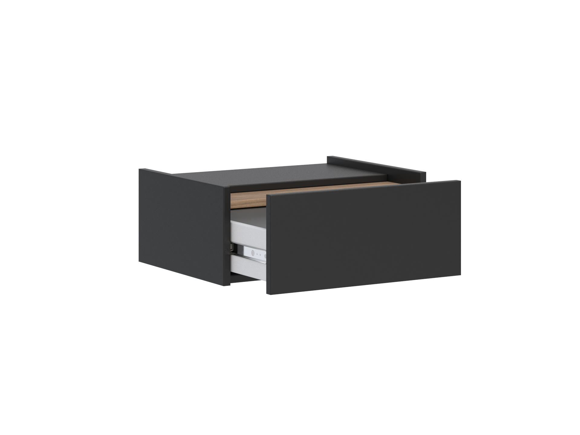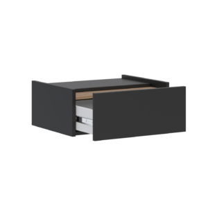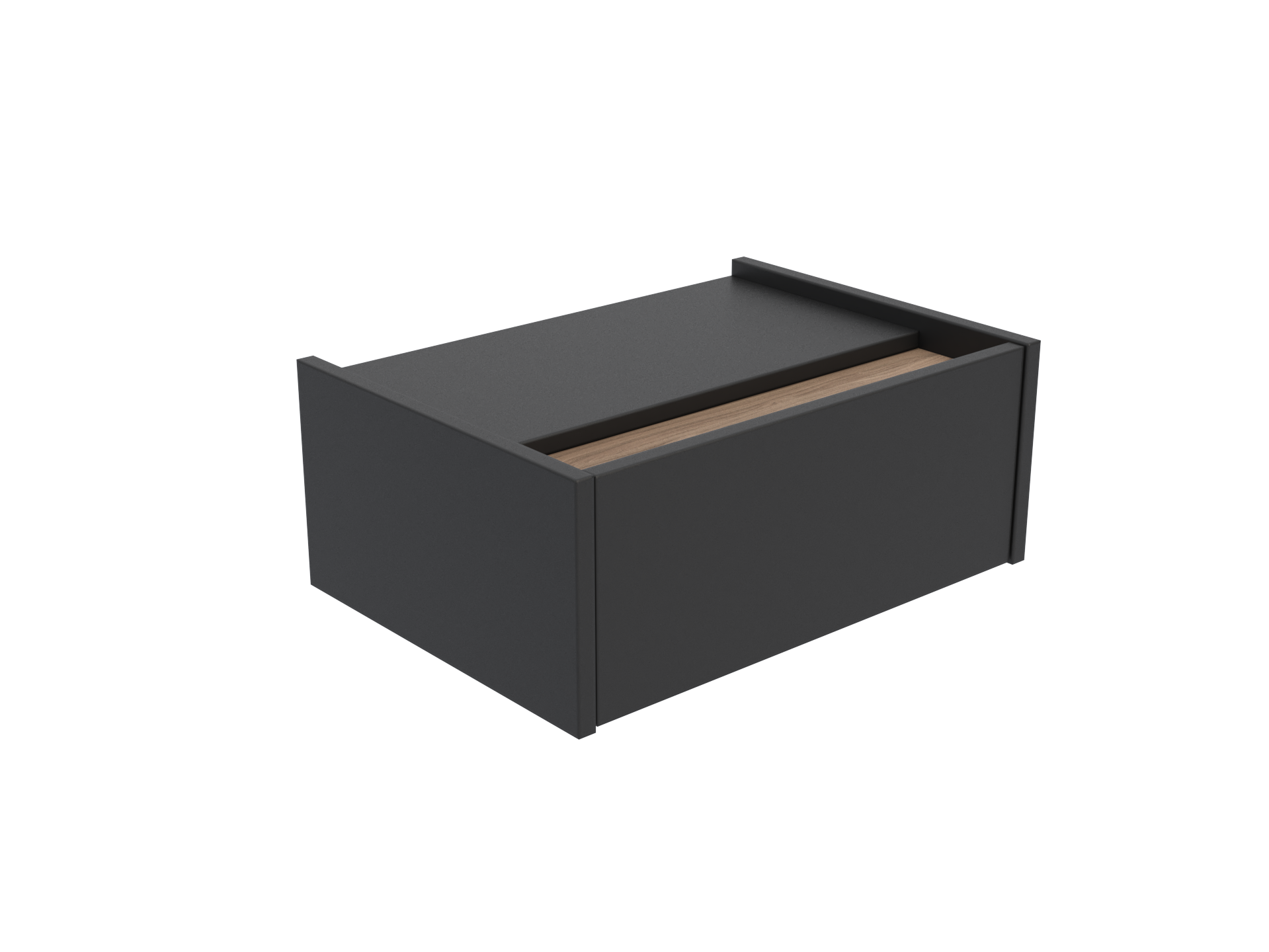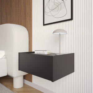 Konstrukcja wisząca nadaje lekkości całej bryle i pozwala na wizualne uporządkowanie przestrzeni wokół łóżka. Kompaktowe wnętrze oferuje praktyczne miejsce na najpotrzebniejsze przedmioty – książkę, telefon czy drobne akcesoria – zapewniając wygodę codziennego użytkowania.