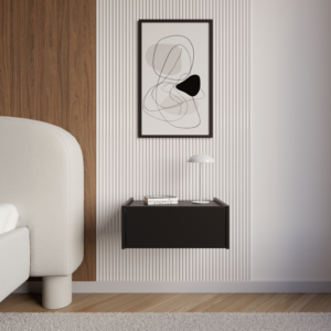 Wisząca forma szafki wprowadza do wnętrza lekkość i nowoczesny charakter, jednocześnie ułatwiając utrzymanie porządku wokół łóżka. Przemyślane wnętrze zapewnia wygodne miejsce na najpotrzebniejsze rzeczy – od książki po telefon czy drobne akcesoria – dzięki czemu wszystko masz zawsze pod ręką.