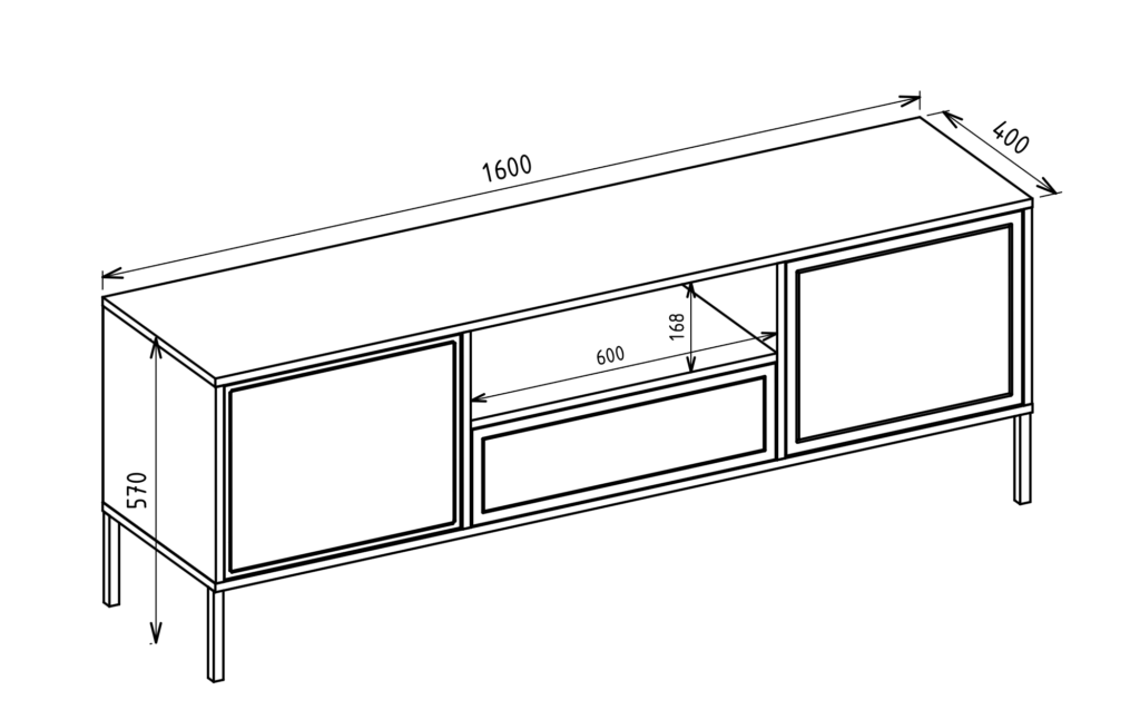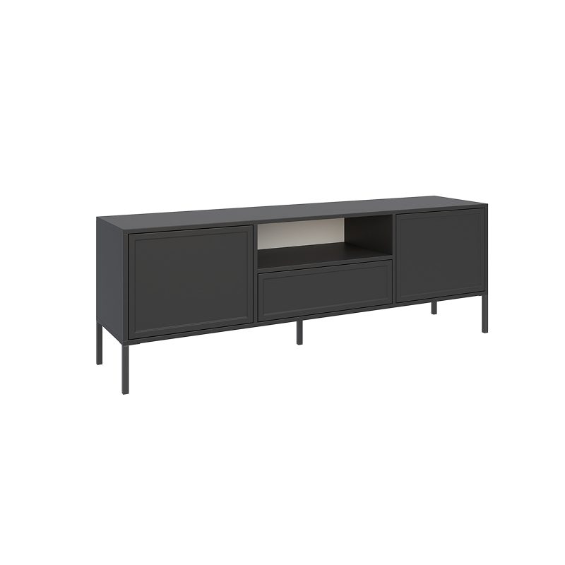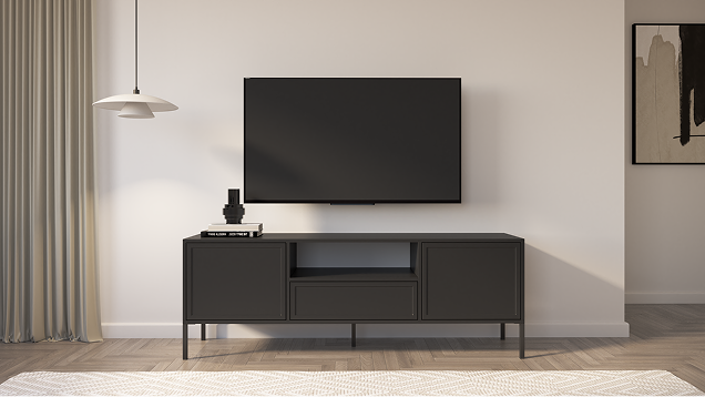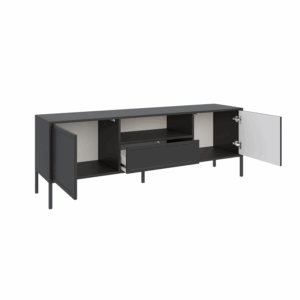Za gładkimi frontami znajdują się przestrzenie idealne do przechowywania sprzętu RTV, pilotów czy akcesoriów. Harmonijne proporcje i dbałość o detale sprawiają, że szafka nie przytłacza — staje się naturalną częścią wystroju salonu.