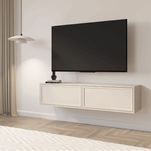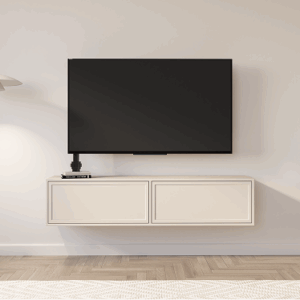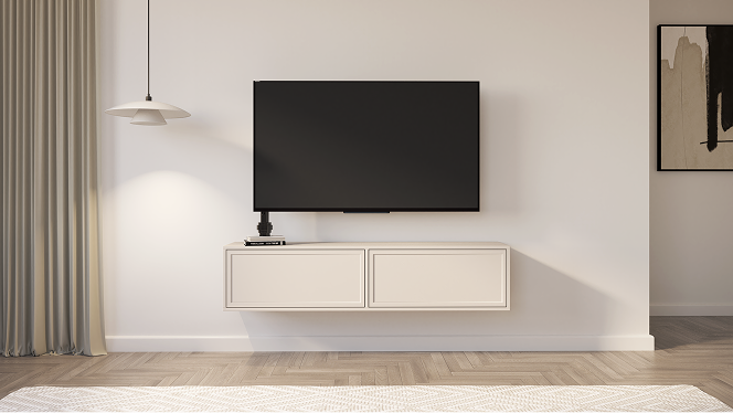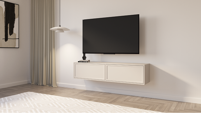 Dzięki konstrukcji wiszącej mebel nie tylko oszczędza przestrzeń, ale też wprowadza wizualną harmonię. Wnętrze szafki zapewnia wygodne miejsce na sprzęt multimedialny, a precyzyjne wykończenie podkreśla wysoką jakość wykonania.