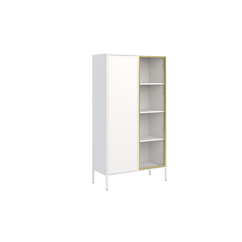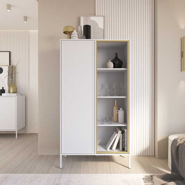 Witryna oferuje przestrzeń do wyeksponowania dekoracji, porcelany czy szkła, zachowując przy tym wrażenie porządku i harmonii. Gładkie fronty i precyzyjnie dopasowane detale nadają meblowi wyrafinowany charakter.
