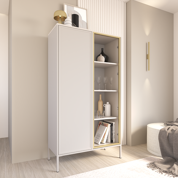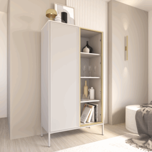 Witryna oferuje przestrzeń do wyeksponowania dekoracji, porcelany czy szkła, zachowując przy tym wrażenie porządku i harmonii. Gładkie fronty i precyzyjnie dopasowane detale nadają meblowi wyrafinowany charakter.