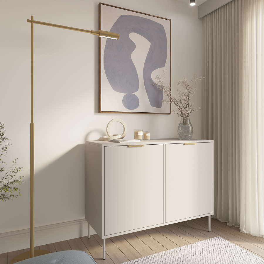 Kolekcja Vena to nowoczesny minimalizm przełamany subtelnym, złotym akcentem. Komoda dwudrzwiowa, zaprojektowana przez zespół SOLVEE, łączy prostotę formy z delikatnym detalem w postaci krawędziowych uchwytów w kolorze złota. To mebel, który przyciąga wzrok elegancją i lekkością.