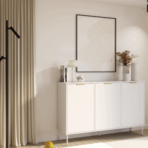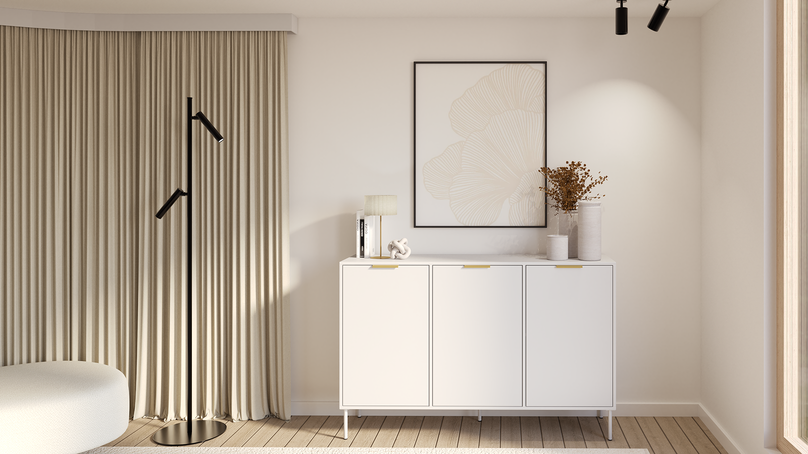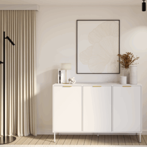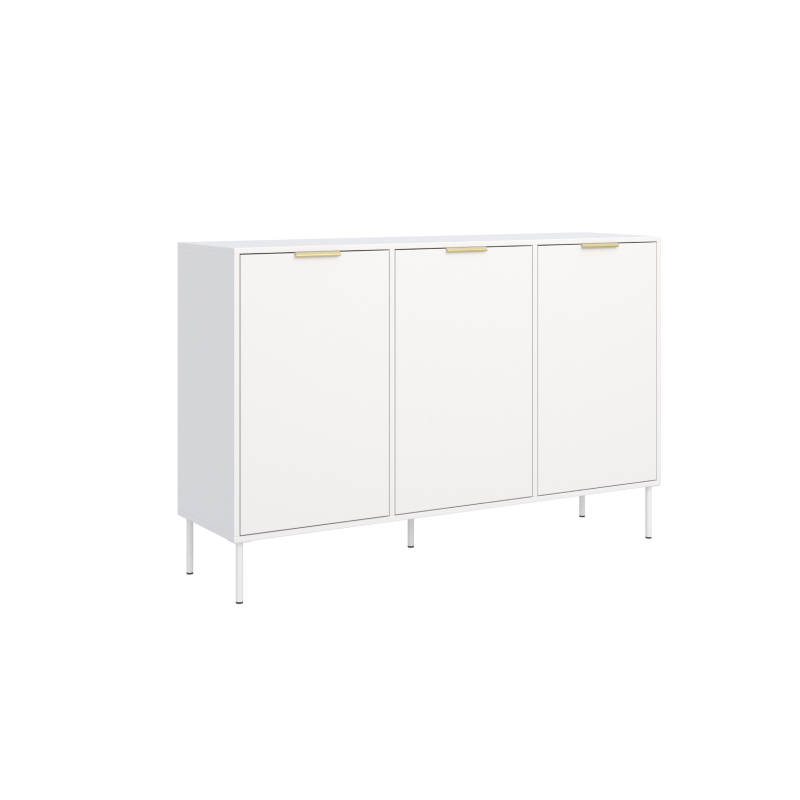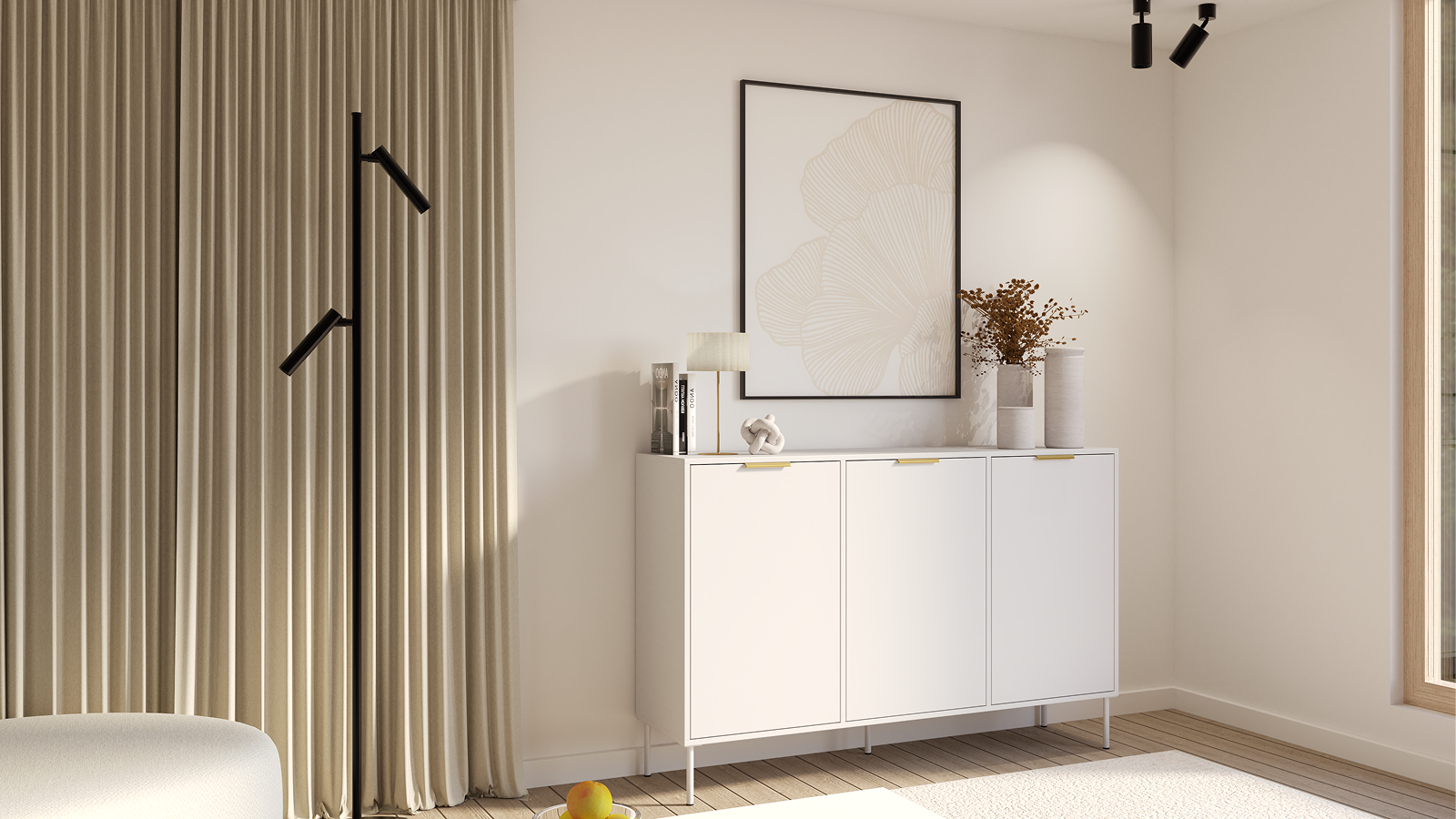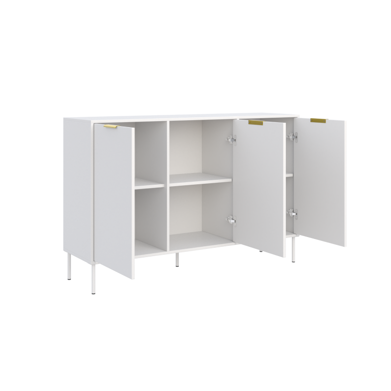 Komoda trzydrzwiowa z kolekcji Vena to połączenie funkcjonalności, nowoczesności i wyrafinowanego stylu. Projektanci SOLVEE stworzyli mebel, który zachwyca czystością formy oraz delikatnym, złotym detalem, podkreślającym jego elegancki charakter.