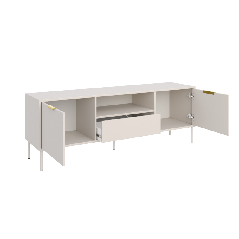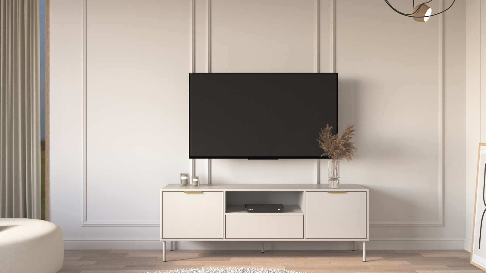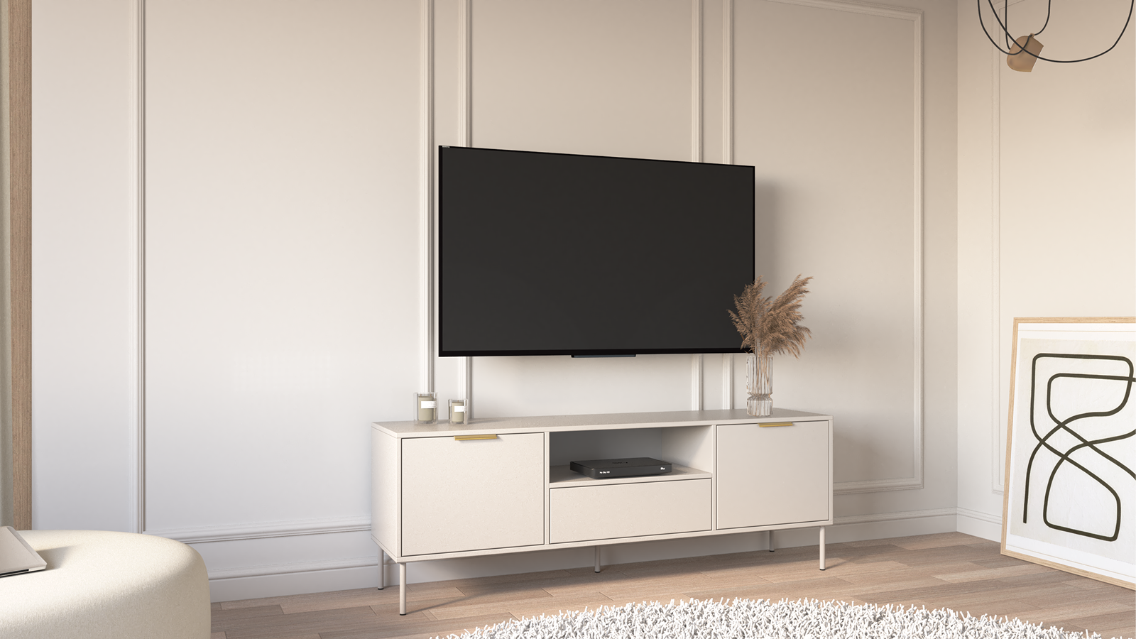 Dzięki swojej funkcjonalności szafka zapewnia wystarczająco dużo miejsca na sprzęt multimedialny, kable i akcesoria. Harmonijne proporcje i elegancki wygląd sprawiają, że doskonale wpisuje się w każdą współczesną aranżację salonu.